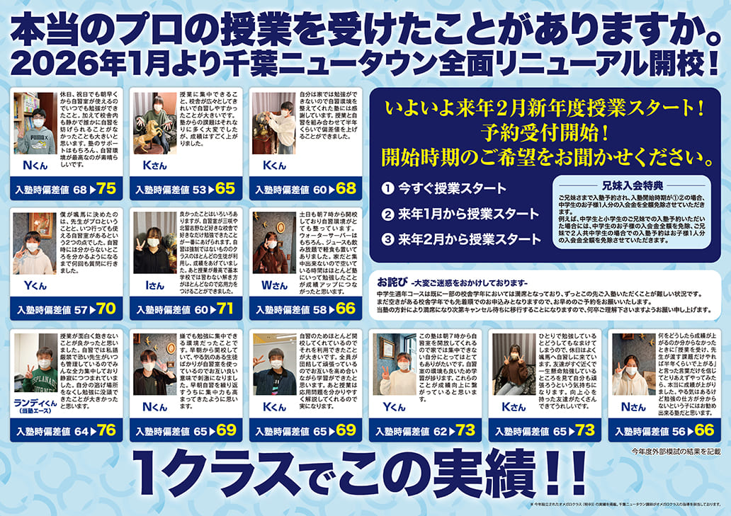 偏差値72に対応させたカリキュラムです。県千葉、県船橋、東葛飾、佐倉、小金、柏など、超人気校へ対応しており偏差値60以上の高校への確実な合格を実現させます。